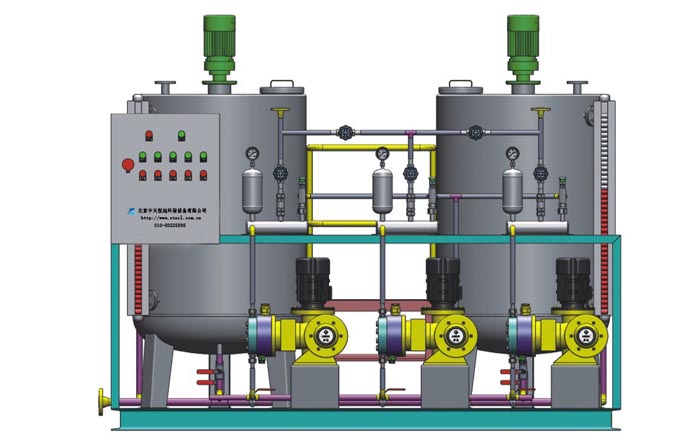 本裝置主要包括藥液溶配系統(tǒng)、計量投加系統(tǒng)、安全系統(tǒng)和控制系統(tǒng)等四部分。
