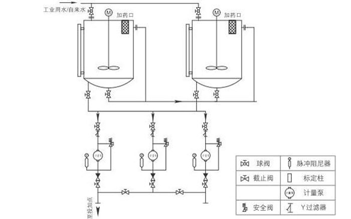 固體磷酸鹽加入溶藥箱內(nèi),然后按比例加入除鹽水或凝結(jié)水攪拌溶解,由計量投加系統(tǒng)加到鍋爐汽包內(nèi)。投加控制可采用手動方式,也可依據(jù)上位系統(tǒng)輸出的控制信號,進行隨動控制,自動投加。