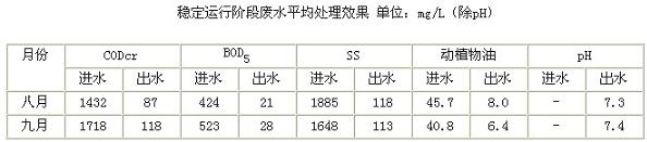 從上表可知,在穩(wěn)定運(yùn)行期間, CODcr的平均去除率為93.5%;BOD5的平均去除率為94.8%; SS的均去除率為93.5%;動(dòng)植物油的平均去除率為83.4%。廢水處理系統(tǒng)排放水中pH值、動(dòng)植物油、CODcr、BOD5、SS六項(xiàng)指標(biāo)均達(dá)到GB8978-1996《污水綜合排放標(biāo)準(zhǔn)》表4中三級(jí)標(biāo)準(zhǔn)。