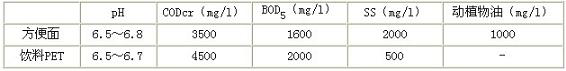 廢水來(lái)源為:方便面生產(chǎn)廢水:100 m3/d;飲料(PET)生產(chǎn)廢水:300 m3/d;員工生活廢水:150 m3/d。設(shè)計(jì)廢水水量為600m3/d。