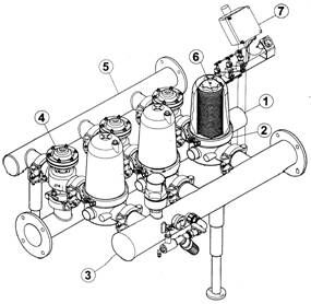 過濾系統(tǒng)由六個模塊化的過濾單元組合而成,由共同的進水口、出水口及排污口連接在一起。過濾器主要包括下列組件: